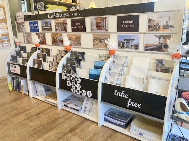 足元には今までメインスペースを飾っていただいたメーカーさんのオシャレなパンフレットが