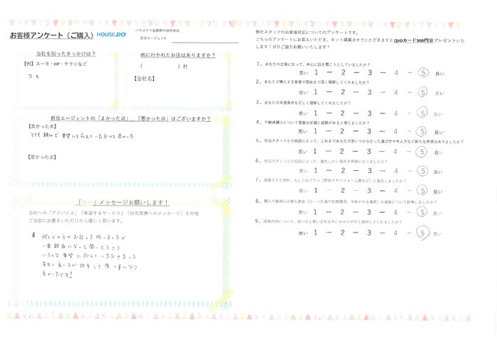ご成約おめでとうございます! 約2年間にはじめてお話しさせて頂き、 最後までお手伝いさせて頂きうれしく思います 新居で家族仲良くお過ごしください★