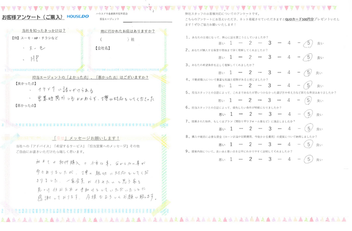 一家全員が住みたいと思う家を見つけ住むための手助けをして頂けたことに感謝しております。