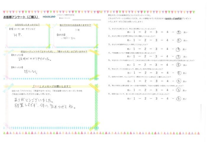 この度は物件の購入、誠にありがとうございます。 数ある不動産会社から当社をお選びいただき、大変光栄です。 新生活が素晴らしいものになりますように心よりお祈り申し上げます。 今後も何かございましたらいつでもお気軽にご相談ください。