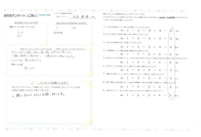 新居のお手伝いが出来て光栄です。 また物件以外でもペットのお話やプライベートなお話をさせて頂き、こちらもお話しすることができ感謝しています。引渡しまで引き続き宜しくお願い致します。