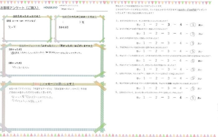 新居探しのサポートが出来て嬉しく感じています。 またプライベートとしても子育てなどのお話もさせて頂き 楽しい時間を頂きました。 今後ともよろしくお願いいたします。